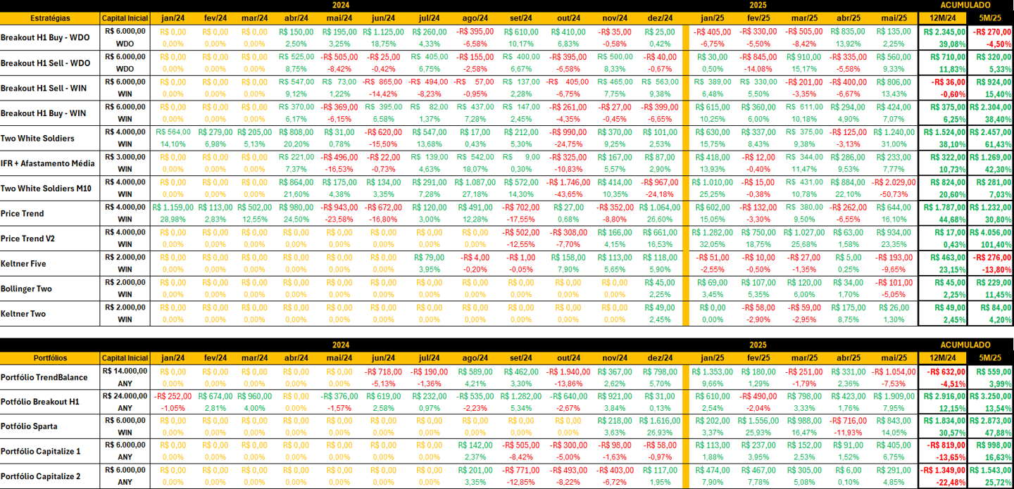 Resultados das estratégias até maio de 2025.